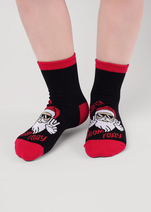 детские носки с выделенным мыском, пяткой и бортом, с рисунком лицо деда мороза и надписью удачи в новом году