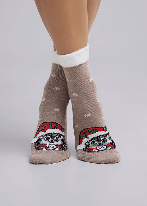 женские новогодние носки с рисунком ёжик и бортом из пряжи травка