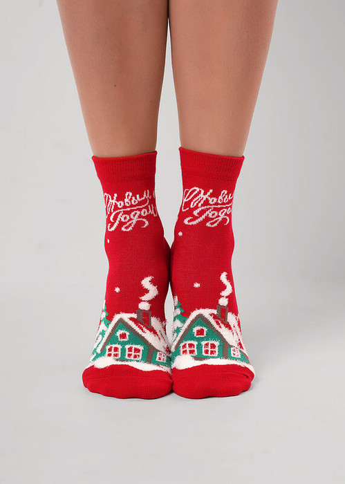 Носки женские с рисунком дом в зимнем лесу, снег выполнен из пряжи травка, и надписью С Новым годом!