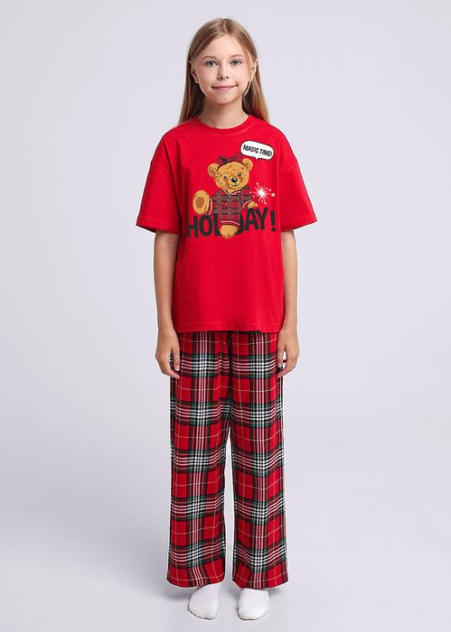 Новогодняя пижама для подростков,состоящая из футболки и брюк. Футболка свободного кроя спереди украшена милым тематическим принтом. Брюки прямые среднего объема с эластичным поясом.