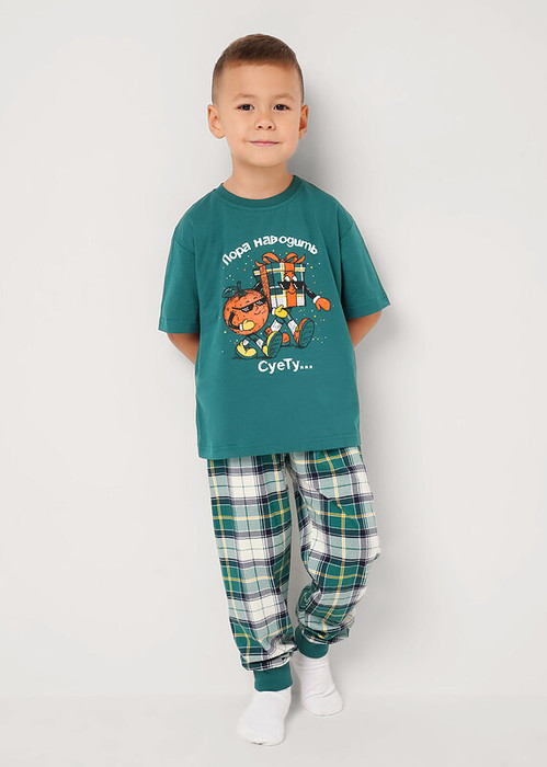 Новогодняя хлопковая пижама для мальчика, состоящая из футболки и брюк. Футболка свободного кроя дополнена оригинальным принтом спереди. Брюки умеренного объёма с эластичным удобным поясом, выполнены из хлопкового полотна в стильную клетку.