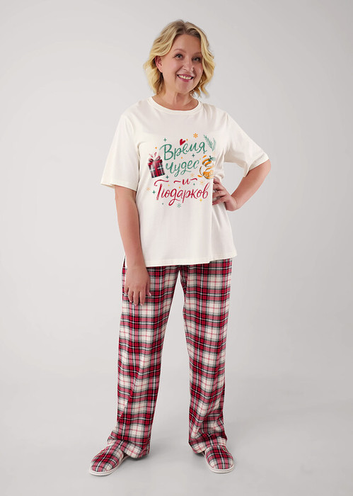 Пижама из хлопкового трикотажного полотна. Футболка прямого кроя. Короткий втачной рукав. Округлая горловина с обтачкой. Спереди принт. Боковые разрезы,вшивка. Брюки из трикотажного полотна с карбоном прямые, пояс на внутренней резинке с киперной лентой.