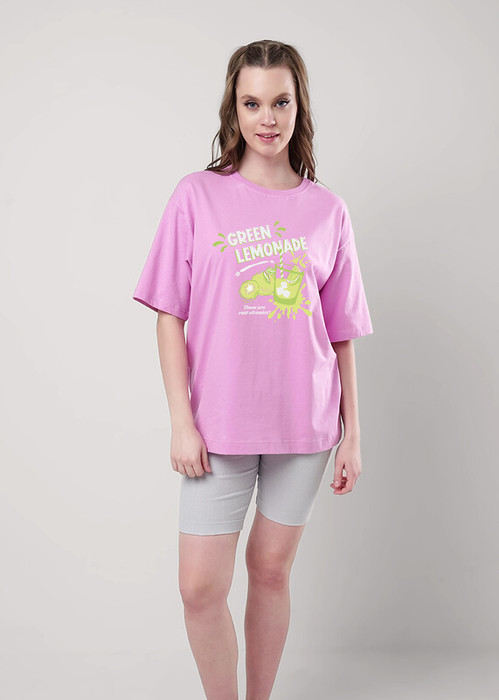 Пижама для дома.Футболка из трикотажного полотна. Округлая горловина с обтачкой. Втачной короткий рукав. Сзади средний шов.Спереди принт, нашивка.Шорты длинные, облегающие из трикотажного полотна кашкорсе.По талии притачная резинка жаккард, нашивка.