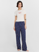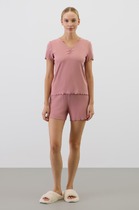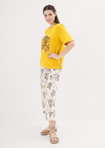 Набор одежды из трикотажного полотна.Футболка прямого кроя,по горловине обтачка с контрастным цепным стежком.Короткий втачной рукав,внизу вышивка.Спереди принт со вспенкой. По бокам разрезы. Бриджы на резинке с киперной лентой. Карманы с отрезным бочком.