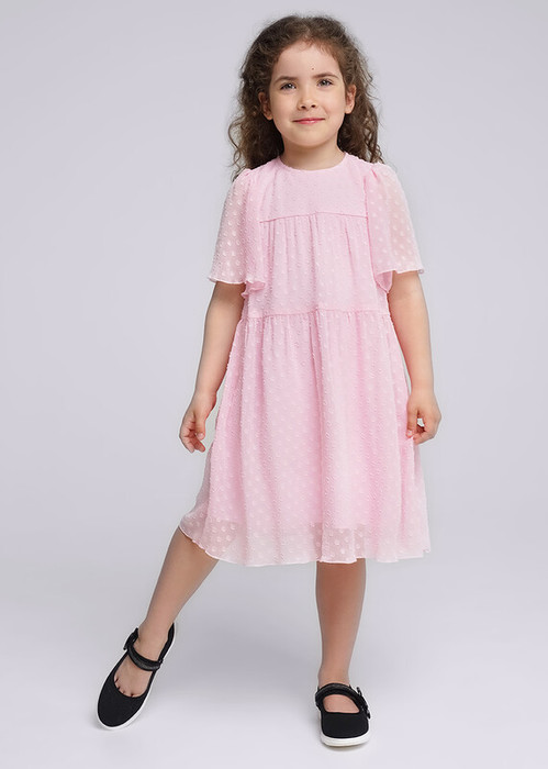 Воздушное как облако! Нарядное платье для девочки выполнено из шифона. Короткие рукава и пышная ярусная юбка. Нижний слой платья - из мягкого хлопкового трикотажа, верхний слой - из фактурного шифона.