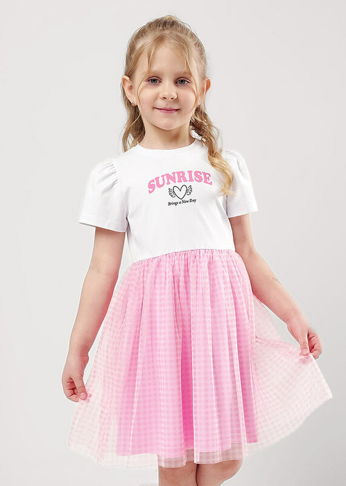 Лёгкое платье из трикотажного полотна станет прекрасным дополнением к твоему гардеробу! Стильная цветовая гамма, объёмный рукав и пышная юбка из сетки- всё для создания яркого повседневного образа и отличного настроения!