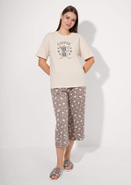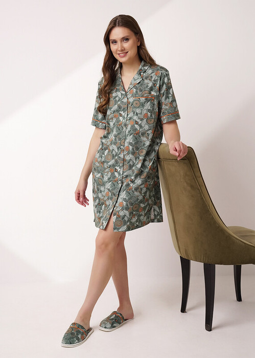 Платье для дома и отдыха прямого силуэта из хлопкового трикотажного полотна. Застёжка на пуговицы, отложной воротник с лацканами. Втачной короткий рукав, внизу с контрастным кантом. Спереди накладной карман с контрастным кантом. Боковые разрезы.