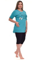 Платье для дома и отдыха из хлопкового трикотажного полотна прямого кроя, длиной до колена. Короткий втачной рукав. Округлая горловина с обтачкой. По бокам разрезы. Спереди принт.