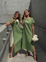 Платье для дома и отдыха из хлопкового трикотажного полотна с эластаном - кашкорсе. Втачной короткий рукав. Округлая горловина с обтачкой. По низу рукава и изделия мелкий оверлок. Спереди принт.