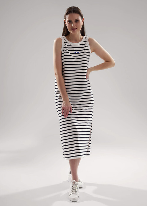 Платье для дома и отдыха прямого силуэта из хлопкового трикотажного полотна, без рукавов среднее плечо. По горловине и пройме окантовка. Спереди принт вспенка, боковые разрезы.