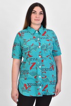 Платье свободного силуэта из хлопкового трикотажного полотна с добавлением модала. Короткий слегка спущенный рукав. По горловине обтачка с кружевом. По талии рез с присборенной юбкой. По бокам узкое кружево 2 ряда. Спереди нашивка, сзади принт.
