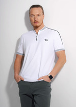 Футболка-поло мужское из хлопкового полотна с добавлением эластана, с воротником, функциональной планкой на пуговицы и карманом. Изделие выгодно подчеркивают лаконичная нашивка по низу изделия. Хорошее дополнение к брюкам или джинсам.