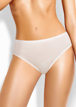 Трусы бикини женские из эластичного хлопкового полотна. По бокам вставки из кружева. Обработка краев по талии и ноге - ажурная резинка с фестоном, точечный зигзаг. По переду атласный бант.