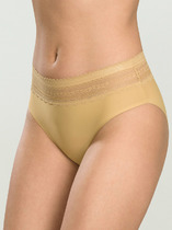 Бикини из однотонного хлопкового полотна. На детали переда по бокам расположены симметричные кружевные вставки. По ножкам обработаны резинкой с фестоном, по поясу - атласной резинкой. Спереди по центру - небольшой бант.