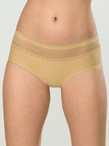 Трусы-бикини женские из полиамида с эластаном. По переду вставки из сетки. Обработка краев - подклееный край. Хлопковая ластовица.