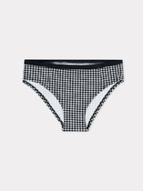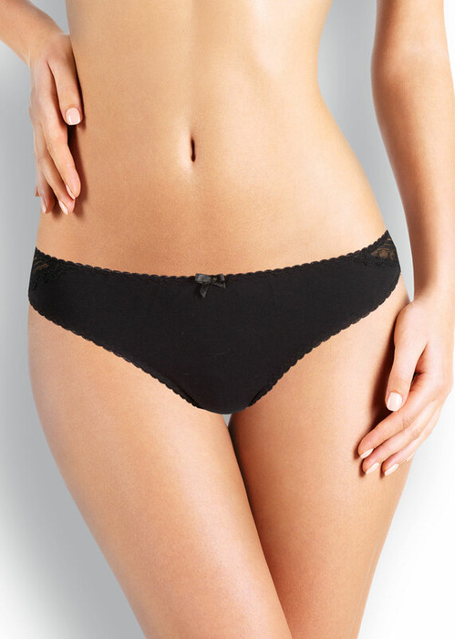 Бразилиано. Комбинированная модель: перед - однотонное хлопковое полотно, спинка - кружево. По талии и ножкам спереди обработаны резинкой с фестоном. В центре на детали переда расположен небольшой атласный бант.
