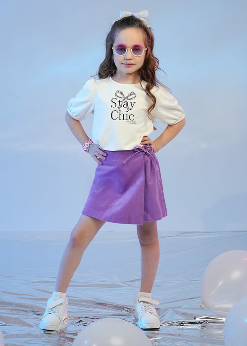 Стильная светло-фиолетовая юбка-шорты из мягкого микровельвета с запахом по переду. Модель дополнена декоративной завязкой и комфортной резинкой на талии, создающей изящный силуэт. Сочетай юбку-шорты с рубашкой и футболками из новой коллекции!