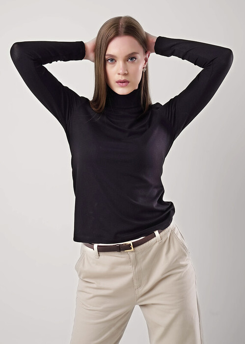 Водолазка из трикотажного полотна рибана с вискозой. Длинный втачной рукав. По горловине стойка.