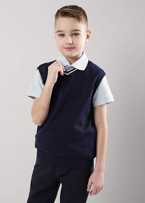 Вязаный жилет для мальчика из 100% хлопка с V-образным вырезом горловины. Горловина и низ изделия украшены контрастной полосой.