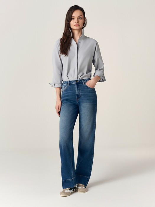 Джинсы straight глубокого синего цвета с имитацией отворотов, контрастной строчкой и мягким эффектом потёртостей можно легко интегрировать в различные образы, экспериментируя и создавая трендовые повседневные стилизации. Благодаря прямому крою и комфортной посадке джинсы подчёркивают фигуру и не сковывают движения.