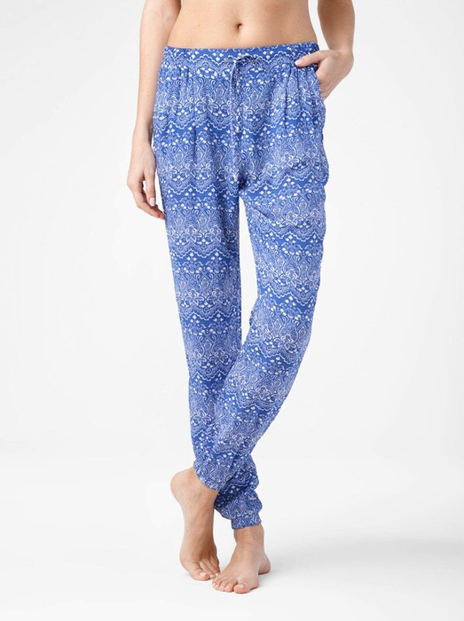 Брюки женские из набивного текстильного материала свободного покроя с боковыми карманами. Низ изделия обработан манжетами с резинкой внутри. Верхний срез изделия обработан притачным поясом с резинкой по бокам и узкими завязками вставленными по-переду в люверсы.
