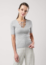Джемпер женский удлиненный с коротким втачным рукавом. Линия плеча - спущенная. Горловина изделия обработана планкой. Трикотажное полотно с эффектом "вытравка". Верхняя и нижняя части джемпера - контрастные.