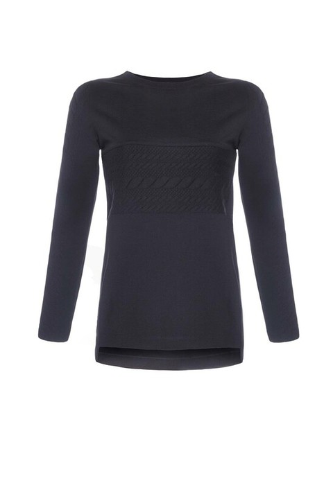 Лаконичный трикотажный джемпер полуприлегающего силуэта подходит для формирования базового повседневного гардероба. Мягкое, эластичное полотно с высоким содержанием вискозы. Изделие отлично держит заданную форму, легко в уходе, сохраняются первозданные качества даже после многочисленных стирок. Длинные рукава декорированы эффектным узором, имитирующим узорную вязку. Отличный комби-вариант для узких джинсов и кожаных леггинсов.
