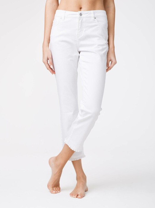 Укороченные джинсы брючного кроя со средней посадкой и эффектом "мгновенная коррекция живота" помогут визуально скорректировать животик и сделать ваш силуэт стройнее. Джинсы сшиты из плотного денима с высоким содержанием хлопка, поэтому джинсы хорошо держат форму, не растягиваются, дарят вам приятные тактильные ощущения и отличаются высокой износоустойчивостью. Изюминку в летний образ внесет бахрома, расположенная в районе щиколотки.