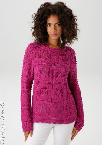 Пуловер с круглым вырезом, изготовлен из африканского хлопка, волнистые манжеты на длинных рукавах и подоле, привлекательное сочетание ажурных узоров, подчеркивает фигуру, внешний материал: 50% хлопок, 50% полиакрил, стандартный размер.