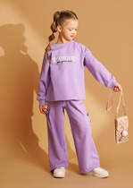Трикотажные брюки для девочки из петельчатого футера трехнитки. Эластичный пояс на резинке регулируется по ширине с помощью шнурка, внизу манжеты на резинке.