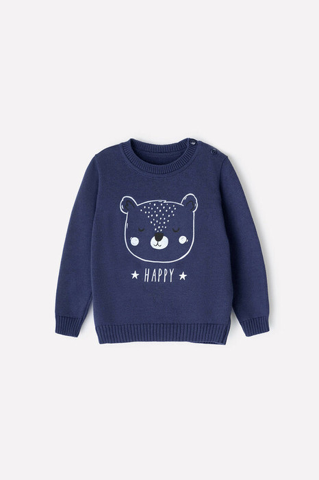 Вязаный джемпер с втачными рукавами. Украшен изображением мишки. Связан из хлопковой пряжи. На рукавах эластичные манжеты. Внизу мягкий пояс. Застёгивается на пуговицу.