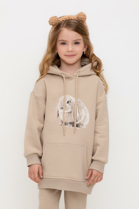 Толстовка с капюшоном и принтом для девочки из футера трехнитки с начесом. Манжеты и пояс выполнены из эластичного полотна. Спереди удобный карман-кенгуру. Оригинальный принт выполнен из стойких текстильных красителей.