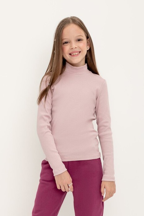 Базовая водолазка для девочки из эластичного кашкорсе, произведенного из натурального хлопка. Изделие имеет воротник с отворотом и длинные втачные рукава. Водолазка сохраняет цвет и форму после многократных стирок.