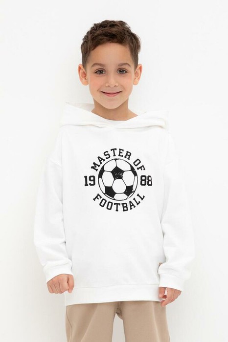 Трикотажное худи с капюшоном для мальчика. Изготовлено из высококачественного петельчатого футера. Манжеты и пояс из эластичного трикотажа в рубчик.