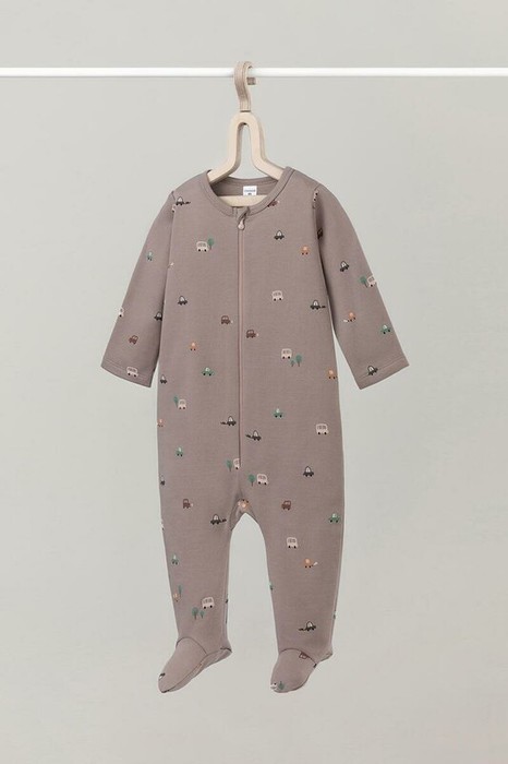 Комбинезон для новорождённых из тонкого трикотажа с начёсом, произведённого из натурального хлопка. Застёгивается спереди на молнию с защитой подбородка. Оригинальная набивка выполнена из стойких гипоаллергенных текстильных красителей. Все трикотажные полотна производятся в соответствии с нормами Швейцарского сертификата ЭкоТекс.