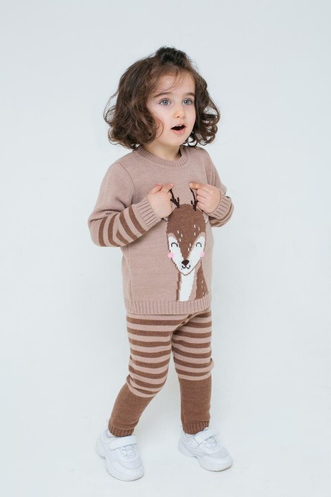 Бежевый вязаный комплект для девочки: джемпер с круглой горловиной и брюки. Украшен вывязанным узором с изображением оленёнка и полосками на рукавах и брюках. Горловина, манжеты и пояс связаны ластиком.