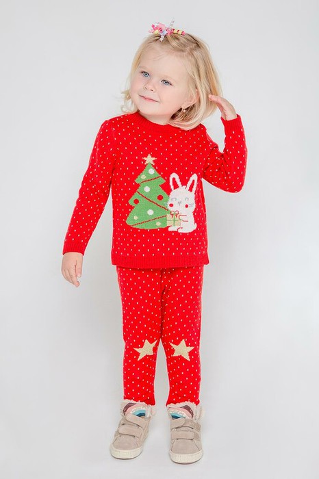Красный вязаный комплект для девочки: джемпер с круглой горловиной и брюки. Украшен вывязанным узором с изображением зайки и новогодней ёлки. Манжеты и пояс связаны ластиком. На коленях - узор со звёздами.