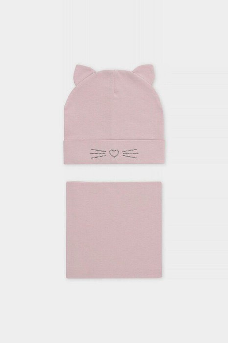 Комплект для девочки: шапка и снуд из хлопкового трикотажа с добавлением эластана, окрашенного стойкими гипоаллергенными текстильными красителями. Изделия хорошо тянутся, после многократных стирок сохраняют цвет и форму.