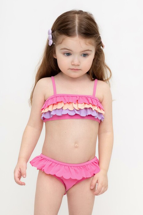 Раздельный купальник для девочки. Топ на эластичных бретелях. Плавки с оборкой на резинке. На груди и спинке воздушные оборки.