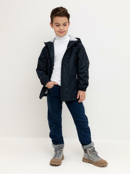 Ветровка для мальчика из мембранной ткани с дополнительной тефлоновой обработкой. Верхняя мембранная ткань 1000/1000 с тефлоновым покрытием отталкивает воду и грязь и обладает «дышащими» свойствами. Подкладка выполнена из сетки, 100% полиэстер. У изделия предусмотрена защита подбородка. Несъемный капюшон утягивается с помощью регулирующего шнура со стопперами. На рукавах эластичные манжеты. Низ изделия регулируется эластичной утяжкой со стопперами. Во всех изделиях верхнего ассортимента для безопасности ребенка предусмотрены светоотражающие элементы.