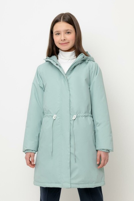 Демисезонное пальто для девочки с утеплителем SEE®: 120 г/м2. Выполнена из мембранной, фактурной ткани с дополнительной тефлоновой обработкой. Данный вид обработки предохраняет изделие от загрязнения и лучше отводит влагу. Подклад из 100% полиэстера. У изделия предусмотрена защита подбородка.  Несъемный  капюшон регулируется с помощью эластичного шнура со стопперами. Низ рукавов на эластичной резинке для лучшего прилегания. На талии утяжка при помощи шнура со стопперами. Боковые  карманы на молнии. Во всех изделиях верхнего ассортимента для безопасности ребенка предусмотрены светоотражающие элементы.