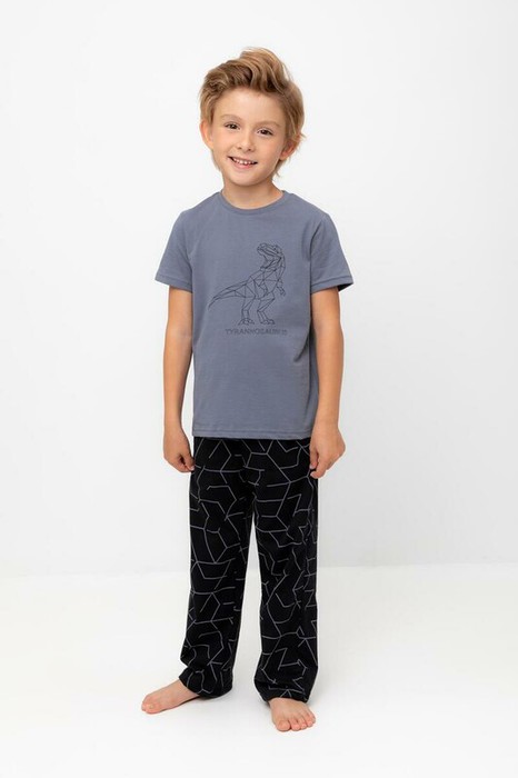 Трикотажная пижама из натурального хлопка.  Футболка с короткими рукавами с принтом. У брюк эластичный пояс на резинке. Оригинальные принт и набивка выполнены из стойких, гипоаллергенных текстильных красителей. Пижама сохраняет цвет и форму после многократных стирок. Все трикотажные полотна производятся в соответсвии с нормами Швейцарского сертификата ЭкоТекс.