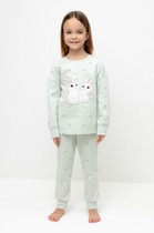 Трикотажная пижама в рубчик из натурального хлопка. Джемпер с длинными втачными рукавами и лосины с эластичной резинкой в поясе. Оригинальная набивка выполнена из стойких текстильных гипоаллергенных красителей. Изделие сохраняет цвет и форму после многократных стирок. Все трикотажные полотна производятся в соответсвии с нормами швейцарского сертификата ЭкоТекс.