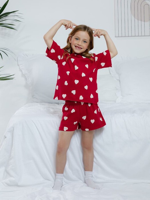 Трикотажная пижама из натурального хлопка для комфортного сна и отдыха. Футболка с короткими спущенными рукавами и шорты с мягкой эластичной резинкой в поясе. Оригинальная набивка выполнена из стойких текстильных гипоаллергенных красителей. Изделие сохраняет цвет и форму после многократных стирок. Все трикотажные полотна производятся в соответствии с нормами швейцарского сертификата ЭкоТекс.