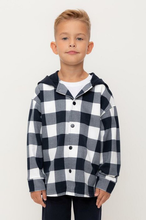 Свободная трикотажная рубашка для мальчика с капюшоном. Выполнена из мягкого петельчатого футера. Застёгивается на кнопки. Модель с закругленным низом и спущенным плечом. По бокам разрезы.