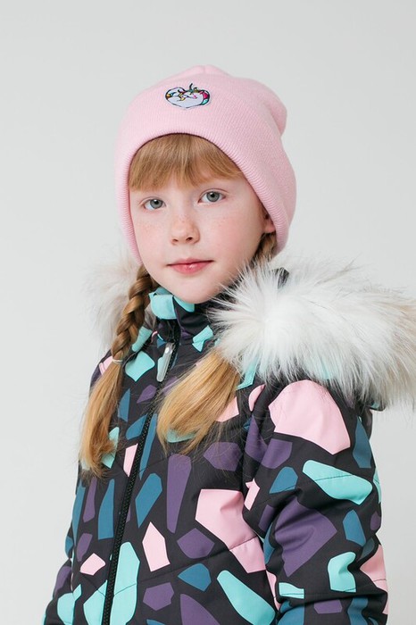 Однотонная розовая шапка с отворотом из полушерсти. Украшена нашивкой с изображением единорожки.