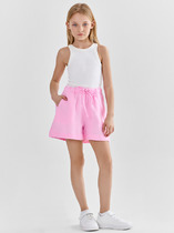 Трикотажные объемные шорты для девочки из набивного петельчатого футера. Пояс по спинке на резинке, по бокам два удобных кармана. Оригинальная набивка выполнена из стойких текстильных гипоаллергенных красителей.
