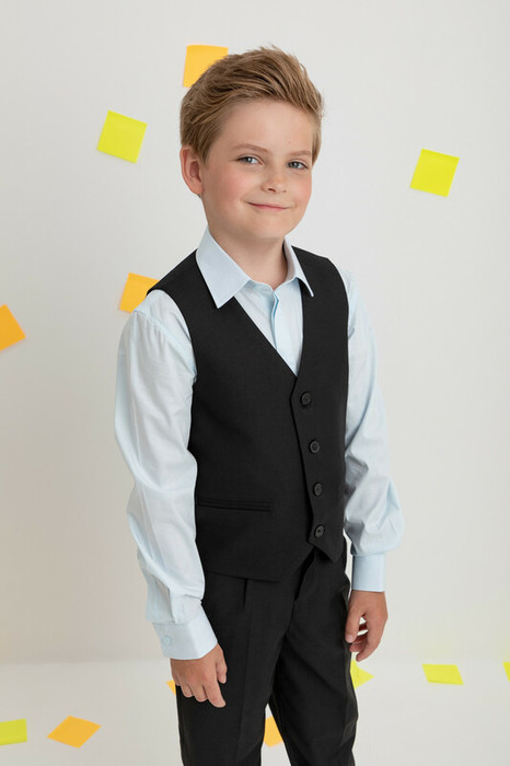 Классический школьный жилет для мальчика. Cпереди застёгивается на пуговицы. По бокам два ложных кармана. Сзади ремешок для регулировки жилета по ширине.