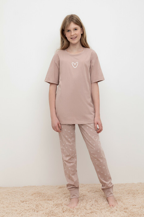 Трикотажный пижамный комплект из натурального хлопка. У футболки короткие рукава со спущенными плечами. Брюки с удобным поясом на резинке и эластичными манжетами. Оригинальная набивка и принт выполнены из стойких, гипоаллергенных текстильных красителей. Все трикотажные полотна производятся в соответствии с нормами Швейцарского сертификата ЭкоТекс.