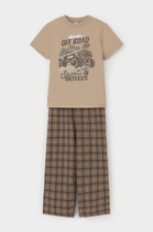 Трикотажный пижамный комплект из натурального хлопка. У футболки короткие рукава. Брюки с удобным поясом на резинке и утягивающим плетеным шнуром. Оригинальная набивка и принт выполнены из стойких, гипоаллергенных текстильных красителей. Все трикотажные полотна производятся в соответствии с нормами Швейцарского сертификата ЭкоТекс.